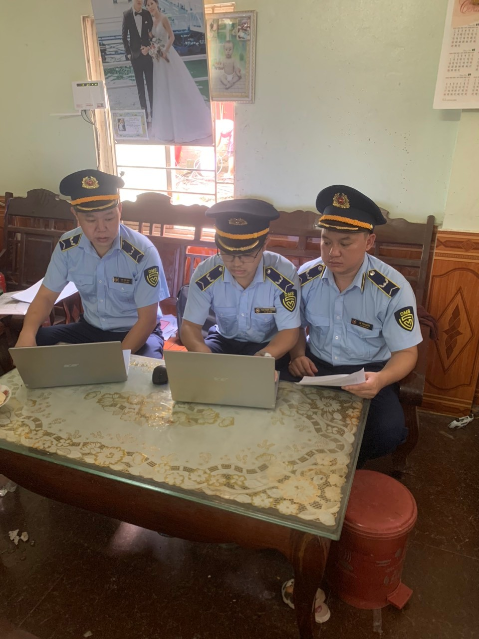 Công chức Đội QLTT số 2, lập biên bản VPHC đối với hộ kinh doanh HTT, địa chỉ: Xã Việt Chu, huyện Hạ Lang