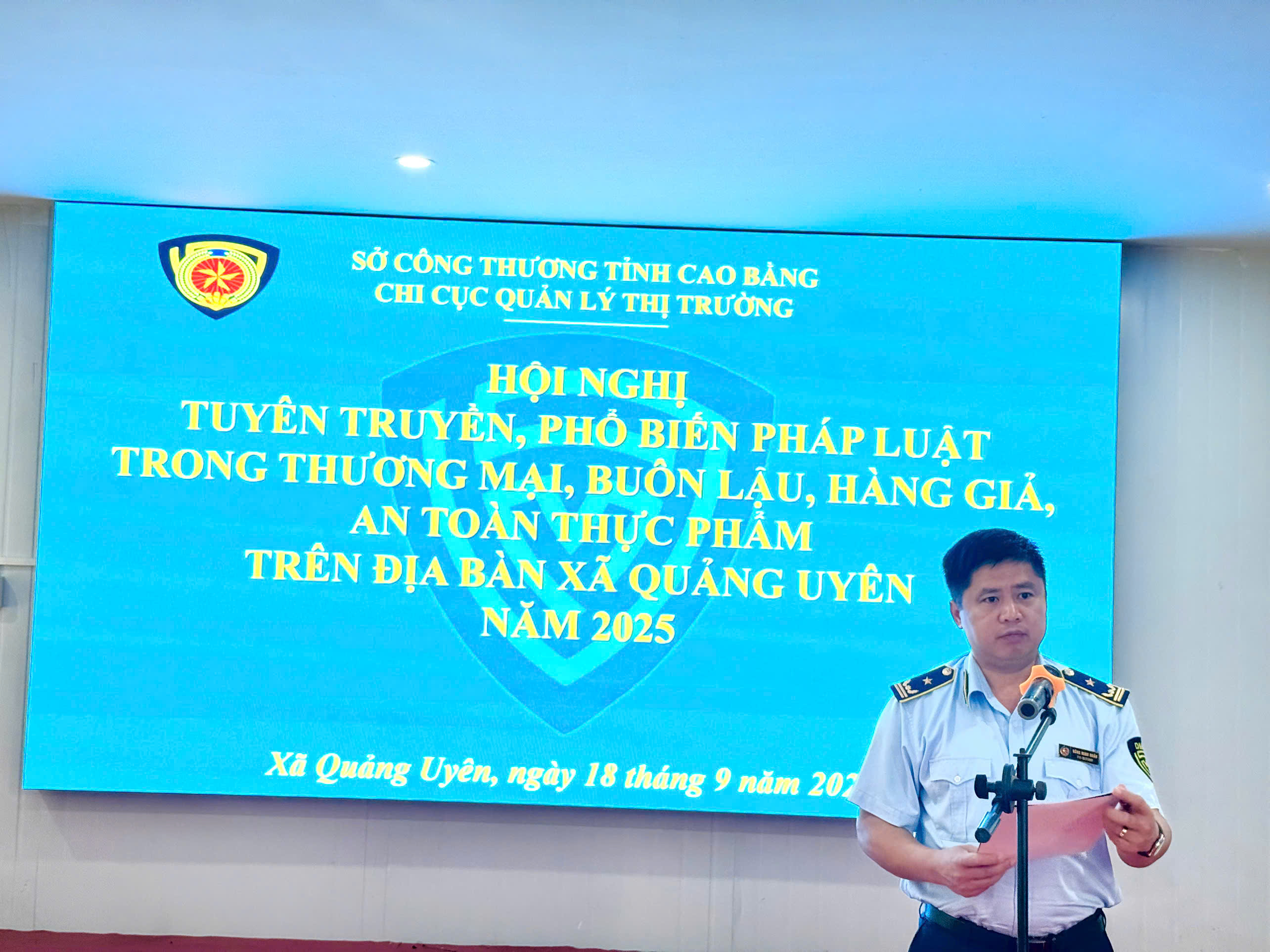 Thực hiện Quyết định số 09/QĐ-QLTTCB ngày 03/01/2025 của Cục Quản lý thị trường tỉnh Cao Bằng (nay là Chi cục Quản lý thị trường trực thuộc Sở Công Thương tỉnh Cao Bằng) về việc ban hành Kế hoạch phổ biến, giáo dục pháp luật năm 2025. Ngày 18/9/2025, Chi cục QLTT tổ chức Hội nghị tuyên truyền, phổ biến pháp luật trong thương mại, buôn lậu, hàng giả, an toàn thực phẩm trên địa bàn xã Quảng Uyên.